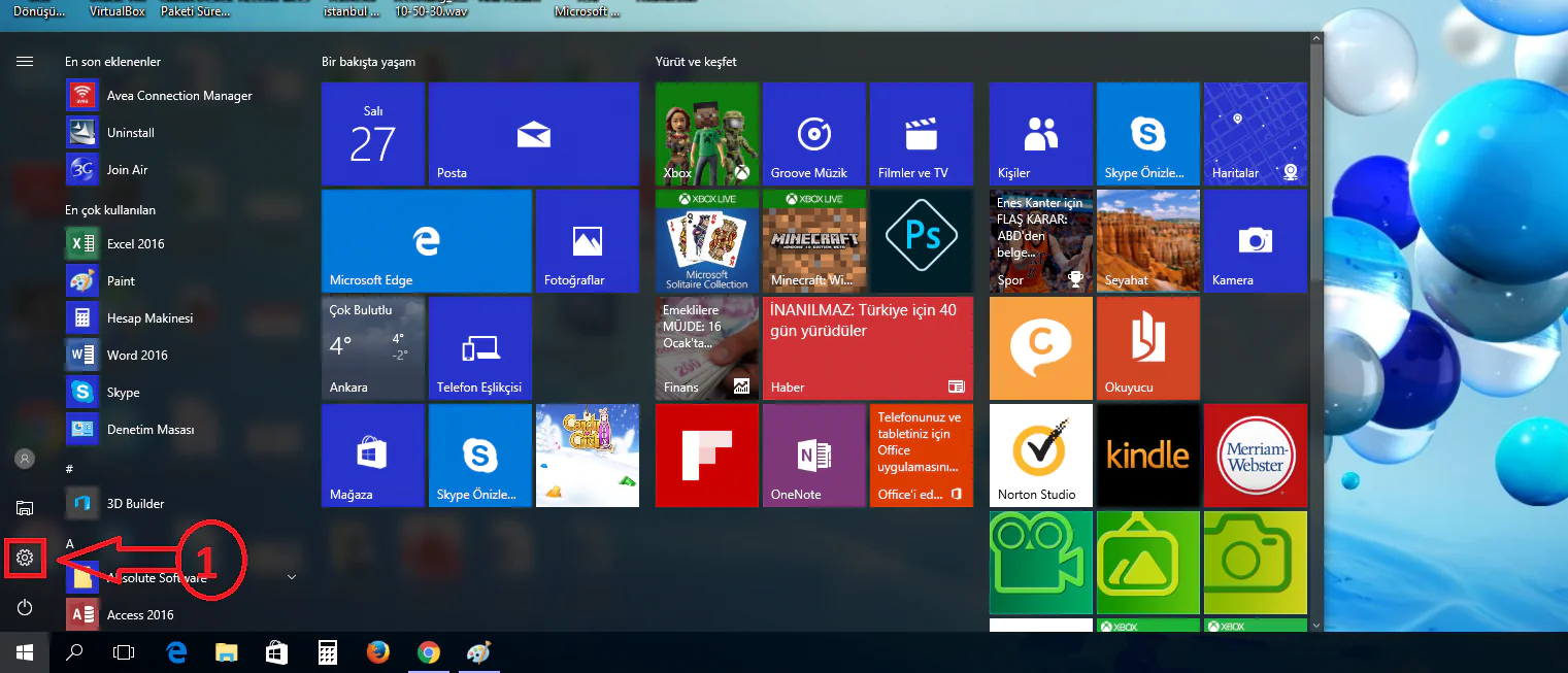 İşlemlerimize, bilgisayarımızda Windows tuşuna basarak açılan ekrandan “Ayarlar” menüsüne girerek başlıyoruz.