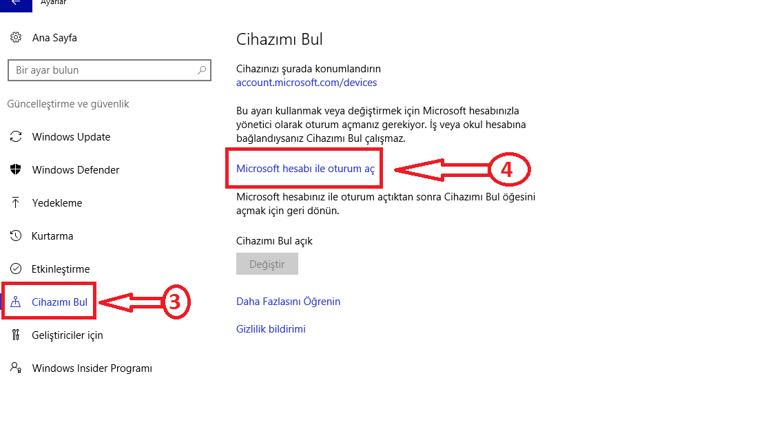 “Güncelleştirme & Güvenlik” ekranından ise “Cihazımı Bul” bölümüne giriyoruz.