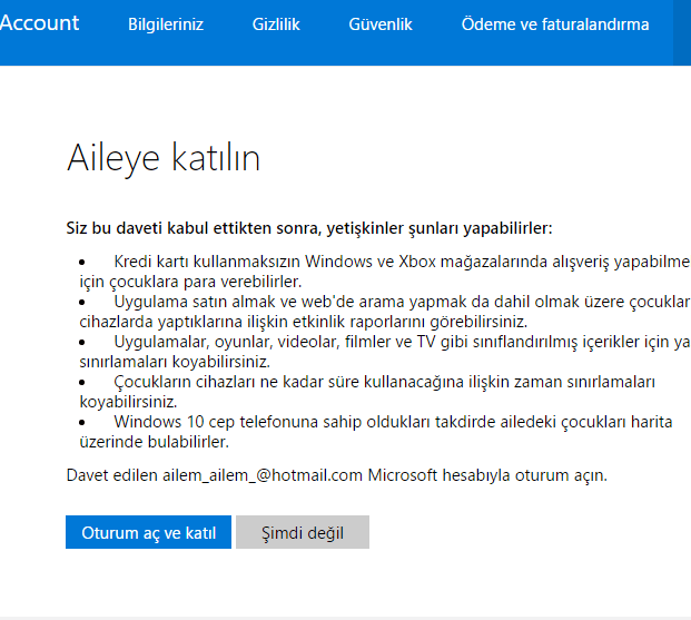 - Gelelim gönderilen davetiye onayına; eklediğiniz çocuk hesabına giriş yapınız. Microsoft Family tarafından bir ileti alacaksınız. Aldığınız iletide, “Çocuk olarak ailesine katılmaya davet etti” “Daveti kabul et” seçeneğini tıklayarak çocuk hesabına dahil olacaksınız. Windows 10’un yeni ‘ebeveyn aile kontrol ayarları’ ekranına geçiş yaparak ayarlarınızı yapınız.