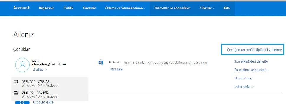 Çocuğunuzun profil bilgilerini yönetme seçeneğinde çocuğununuz son etkinliklerini, ekran süresini ve harcama var ise harcamaları görebilirsiniz.