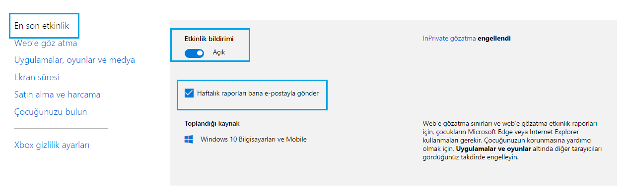 Çocuğunuzun neleri arattığını görmek için “en son etkinlik” menüsüne tıklayın. Sonra “Etkinlik Bildirimi ve Haftalık raporları bana e-posta ile gönder” seçeneğini seçin. Bu seçenekleri açtıktan sonra, çocuğun ziyaret ettiği web sitelerini, indirdiği uygulama ve oynadığı oyunları ve cihazlarında ne kadar süre harcadıklarını doğrudan ‘En son etkinlik’ sayfasından görünür. Ayrıca e-posta yoluyla da size haftalık etkinlik raporları gönderilmesini sağlayabilirsiniz.