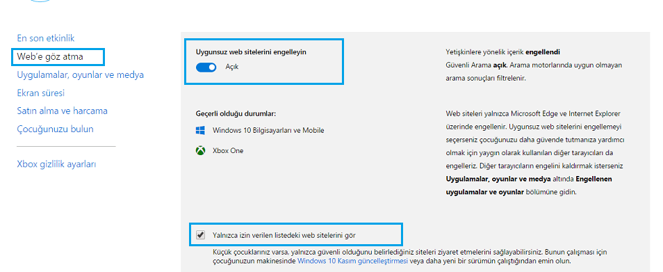Web’e göz atma kısmında “Uygunsuz Web sitelerini engelleyin” ve “Yalnızca izin verilen listedeki web sitelerini gör” seçenekleri işaretli olmalıdır.