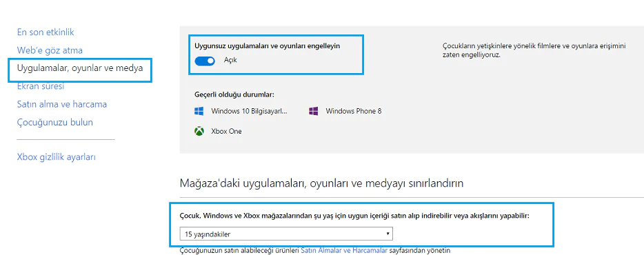Uygulamalar ve oyunlar seçeneğinde “uygunsuz uygulamaları ve oyunları engelleyin” açık olması gerekmektedir. “Mağazadaki uygulamaları, oyunları ve medyayı sınırlandırın” seçeneği altında çocuk yaşını seçiniz.