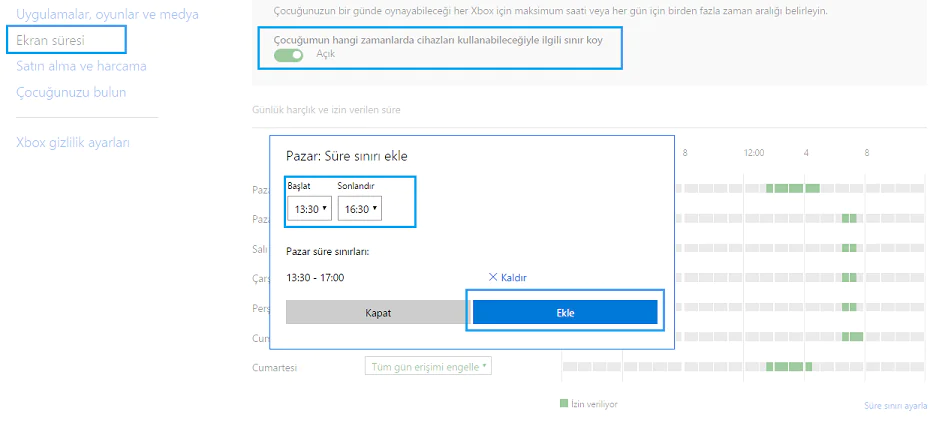 “Çocuğunuzun bir günde oynayabileceği her Xbox için maksimum saati veya her gün için birden fazla zaman aralığı belirleyin” menüsünün altında “çocuğunuz hangi zamanlarda cihazları kullanabileceğiyle ilgili sınır koy” seçeneğini açık hale getirerek haftalık olarak günlerinizi seçebilir, saat aralıklarını belirleyebilirsiniz.