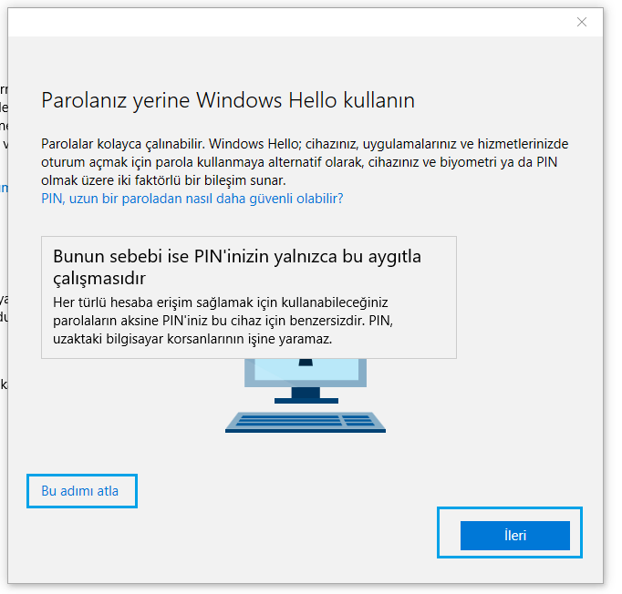 - Oturum açma ekranından sonra isterseniz hesabınıza, parola yerine ‘Windows Hello’ kullanarak giriş yapabileceğiniz bilgisi gelir. ‘Windows Hello’ kullanmak daha kolaydır. Belirleyeceğiniz bir pin kodu ile giriş yapabilirsiniz veya “Bu adımı atla” seçeneği ile geçebilirsiniz.