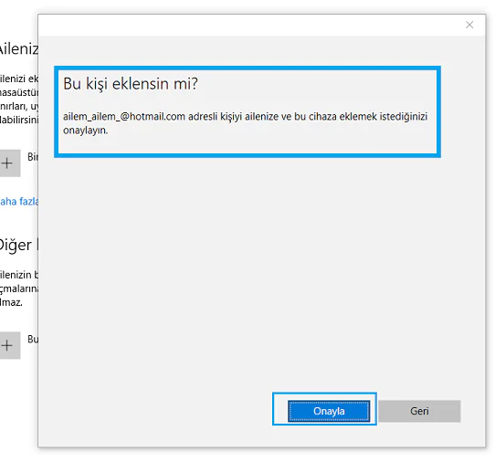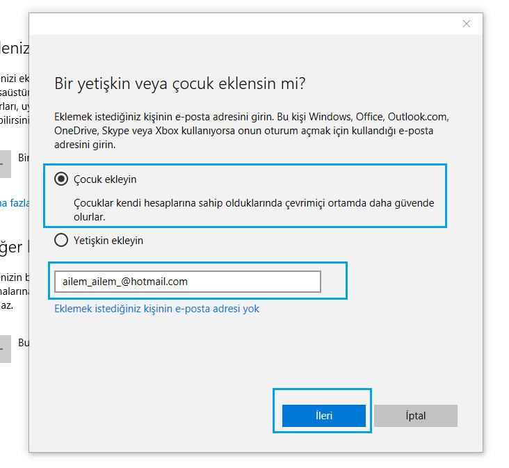 - ‘Aile & diğer kişiler’ seçeneğini tıkladığınızda ailenizden bir yetişkin mi, yoksa bir çocuk mu ekleyeceğinizi soran pencereyle karşılaşacaksınız. Eklemek istediğiniz kişinin e-posta adresini yazarak İleri butonuna tıklayınız. Mail adresi yok ise mail adresi oluşturabilirsiniz.
