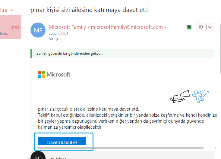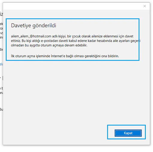- Belirlediğiniz e-posta hesabına bir davetiye gönderilecektir. Belirlediğiniz e-posta hesabını bir Microsoft hesabı ile desteklerseniz ebeveyn kontrolü daha kolay oluyor.