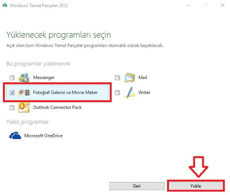 - Bir sonraki adımda aşağıdaki görüldüğü gibi ‘Fotoğraf Galerisi’ ve ‘Movie Maker’ birlikte yükleniyor. Seçimi yaptıktan sonra ‘Yükle’ butonuna tıklayalım.