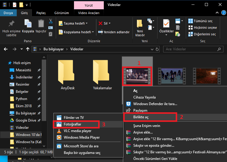 - Öncelikle, düzenlemek (kırpmak –kesmek–) istediğimiz video dosyasına Mouse ile sağ-tıklıyoruz ve açılan menü listesinde ‘Birlikte aç’ seçeneğine geliyoruz ve daha sonra, açılan diğer menü listesinde ‘Fotoğraflar’ uygulamasına tıklıyoruz.