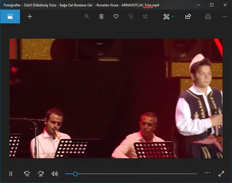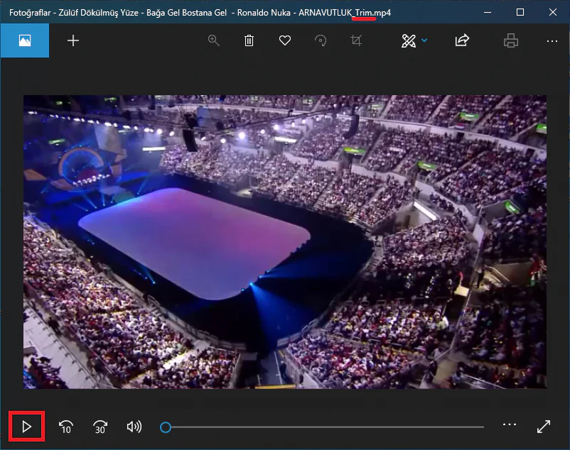 - Kaydetme işlemi tamamlandıktan sonra, ‘Fotoğraflar’ uygulaması, kestiğiniz (kırptığınız) videoyu açacak. Kestiğiniz videoyu oynatmak için çalma (▶) butonuna tıklayın.