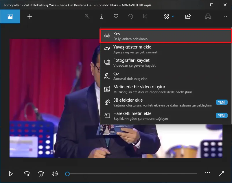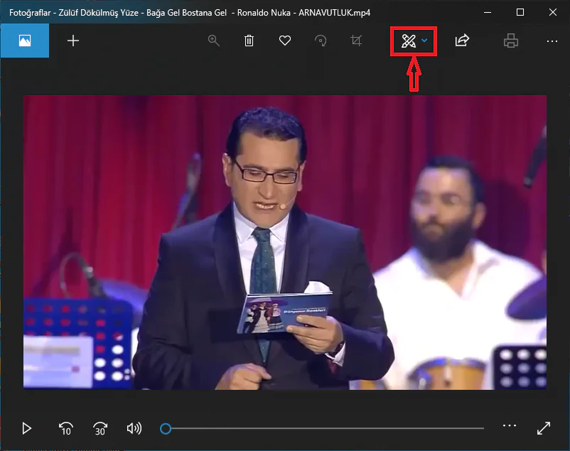 - ‘Fotoğraflar’ uygulaması ile video dosyasını açtıktan sonra, uygulama ekranın üst kısmında bulunan kalem ve fırça simgesi şeklindeki düzenleme menüsüne tıklıyoruz.