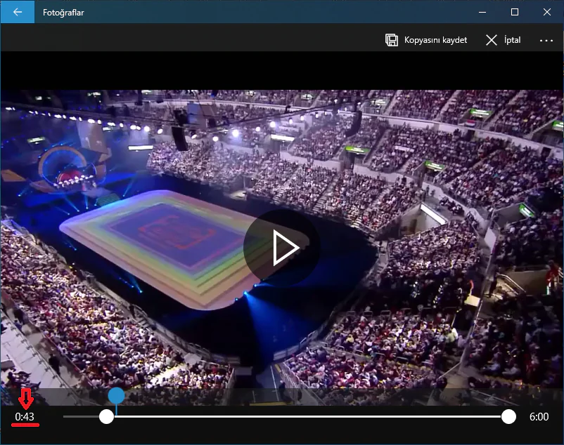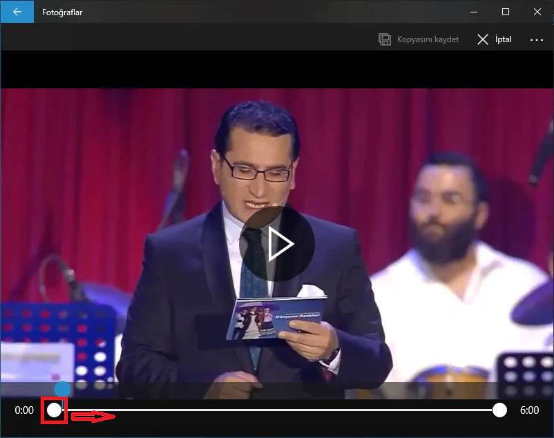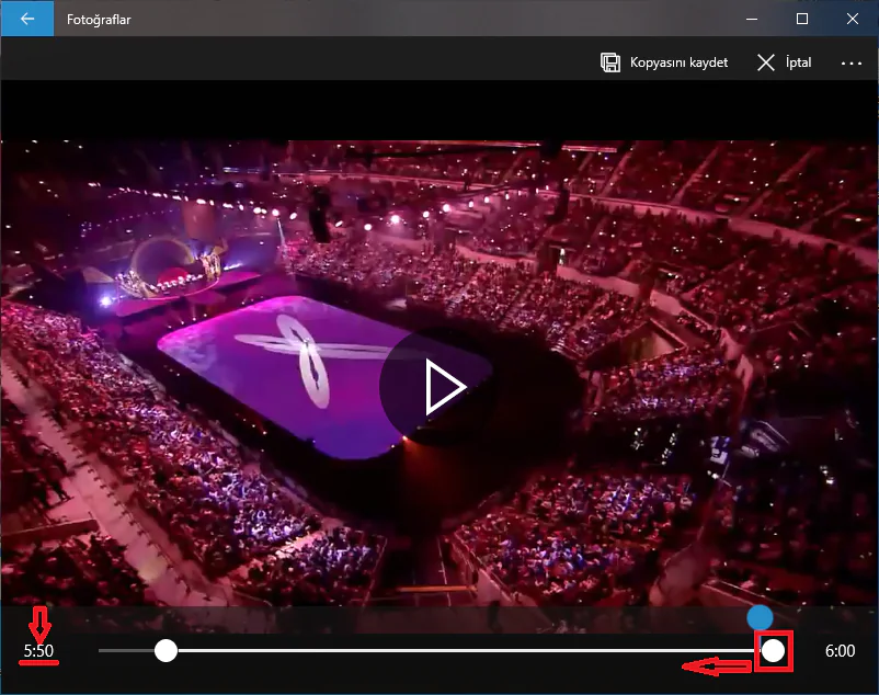 - Beyaz nokta (veya daire) şeklindeki simgeyi sağa doğru sürüklerken, video sahneleri de kare-kare yürütülecek. Video başlangıç yeri olmasını istediğiniz sahneye geldiğinizde beyaz nokta (veya daire) şeklindeki simgeyi sağa doğru hareket ettirmeyi bırakabilirsiniz. Ayrıca, süre kısmından da videodan çıkarmak istediğiniz bölümü belirleyebilirsiniz (ayarlayabilirsiniz).