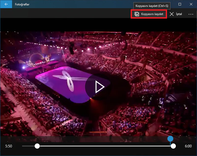- Videonun başından ve sonundan keseceğiniz bölümleri belirledikten sonra, ayarladığınız (kırptığınız) şekilde videonun bir kopyasını kaydetmek için, uygulamanın üst kısmındaki ‘Kopyasını kaydet’ menüsüne tıklayın.