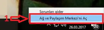 - İşlemlerimize masaüstünde sağ alt köşede bulunan ağ simgesine sağ tuş ile tıkladıktan sonra “Ağ ve Paylaşım Merkezi”‘ne girerek başlıyoruz.