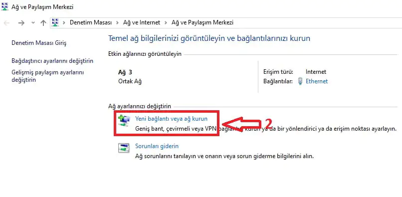 Ağ ve Paylaşım Merkezi”‘ne girdikten sonra, bu bölümde bulunan “Yeni bağlantı veya ağ kurun” linkine tıklıyoruz.