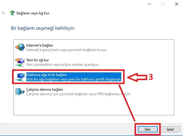 Karşımıza “Bağlantı veya Ağ Kur” ekranı gelecektir. Bu ekrandan “Kablosuz ağa el ile bağlan” seçeneğni seçerek “İleri” butonuna tıklıyoruz.