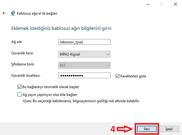 Bir sonraki ekranda ise bağlanmak istediğimiz kablosuz ağ yayınına ait bilgileri girdikten sonra “İleri” butonuna tıklayıp, ağ ekleme işlemini tamamlıyoruz.
