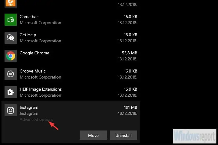 - Uygulamalar ve özellikler bölümünün altındaki Instagram öğesini seçin ve Gelişmiş seçenekleri açın.