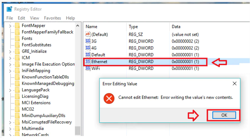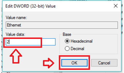 • ‘Ethernet’ değerinin ‘Onaltılık (hexadecimal) tabandaki 1 (yani ölçeklenmemiş olarak) değerini 2 olarak değiştirmeniz gerekecektir. Değeri düzenlemek için yetkiniz yok ise hata verecektir.