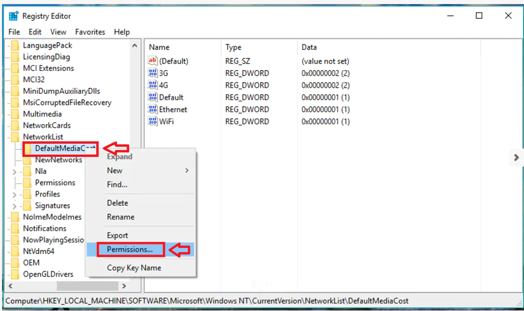 • ‘Kayıt Defteri(Registry)’ penceresi açılacak. Açılan pecerede soldaki menü listesinden sırasıyla ‘HKEY_LOCAL_MACHINE’ → ‘SOFTWARE’ → ‘Microsoft’ → ‘Windows NT’ → ‘CurrentVersion’ → ‘NetworkList’ → ‘DefaultMediaCost DefaultMediaCost’ menülerine tıklayalım.