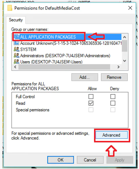 • Açılan pencerede ‘Güvenlik (Security)’ sekmesinde ‘Grup veya kullanıcı adları: (Group or user names:)’ yazısı altındaki kutucukta ‘TÜM UYGULAMA PAKETLERİ’ seçeneğini seçelim ve ardından ‘Gelişmiş (Advanced)’ butonuna tıklayalım.