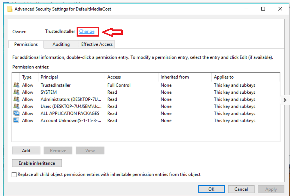 • ‘TrustedInstaller (GüvenilirYükleyici)’ yazısının yanında bulunan ‘Değiştir (Change)’ linkine (bağlantısına) tıklayalım