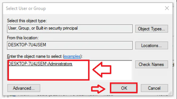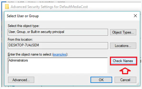 • Açılan ‘Kullanıcı veya Grup Seç (Select User or Group)’ başlıklı pencerede, ‘Seçmek için bir nesne ismi girin (Enter the object name to select)’ kutucuğunun yanındaki ‘İsimleri Kontrol Et (Check Names)’ butonuna tıklayalım.