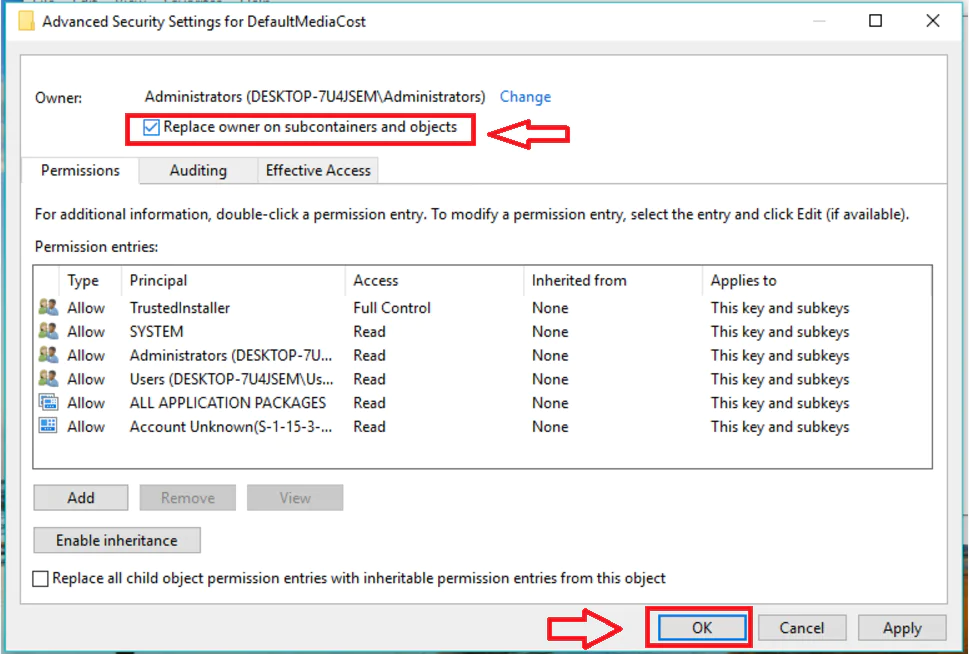 • Ve sonrasında açılan ‘DefaultMediaCost için Gelişmiş Güvenlik Ayarları’ penceresinde ‘Replace owner on subcontainers and objects’ kutucuğunu işaretleyelim ve ‘OK’ butonuna tıklayalım.