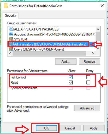 • Öncelikle sol taraftaki listesinde ‘DefaultMediaCost’ menüsüne sağ tıkladıktan sonra, açılan menü listesinde ‘İzinler… (Permissions…)’ menüsüne tıklayalım.