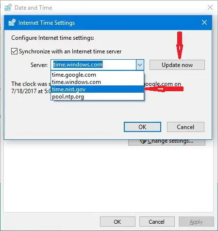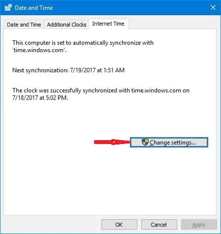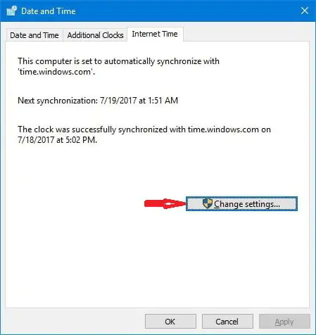 - ‘İnternet saat sunucusuyla eşitle (Synchronize with an internet time server)’ seçeneğinin seçili olduğundan emin olun.
