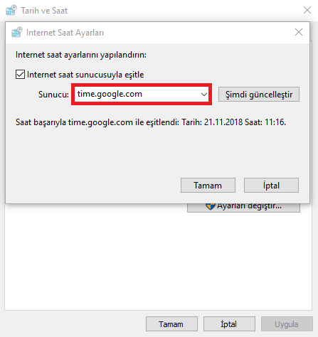 Adımları tamamladıktan sonra, seçtiğiniz yeni sunucu ile internet üzerinden sistem saatini eşitleyecek ve güncel tutacak.