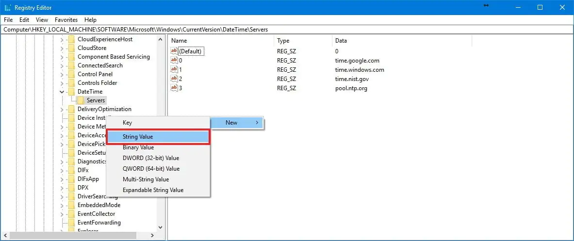 - Açılan ‘Kayıt Defteri (Registry)’ penceresinde adres satırına aşağıdaki bilgileri yazın. HKEY_LOCAL_MACHINESOFTWAREMicrosoftWindowsCurrentVersionDateTimeServers yazın ve Enter’a basın veya sol taraftaki panelden sırasıyla bu menülerine gidin.