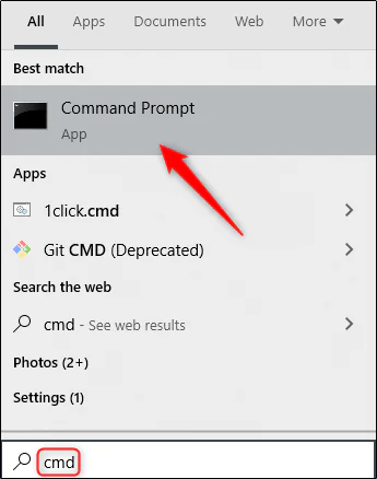 Açık Komut İstemi yazarak arama sonuçlarından “Command Prompt” Windows Search bar ve seçerken “cmd”.