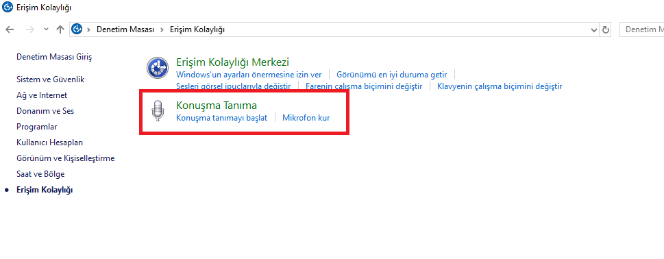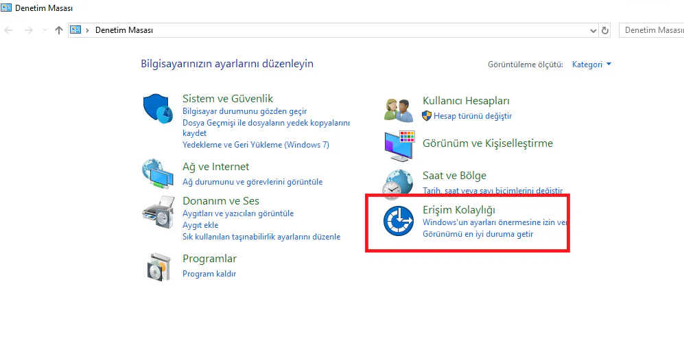 “Denetim Masası – Erişim Kolaylığını Tıklayınız.”