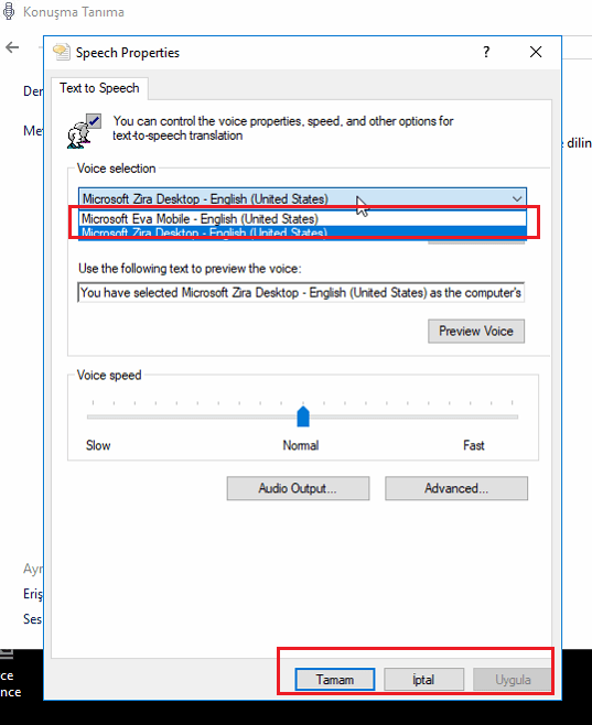 Solda, “Metin Okuma” bağlantısını tıklayınız. Eva Mobile sesi şimdi menüde görünecetir. Yeni yüklediğiniz sesi duymak için Sesin Önizlemesine tıklayınız.