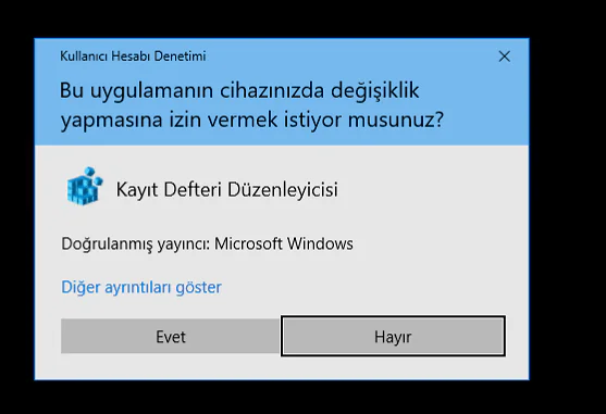 “Regedit komutu” kullanıcı hesabı denetimi uayarı verecektir. “Evet” diyerek geçiniz.