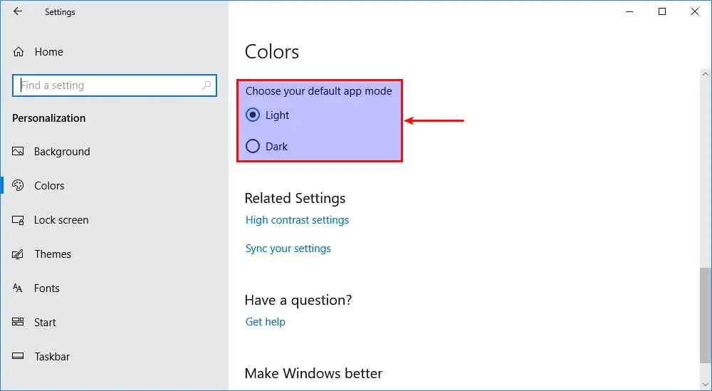 Renk (Color) ayarları penceresi açıldığında, sağdaki kaydırma çubuğunu Varsayılan uygulama modunu seçin (Choose your default app mode) seçeneğini görene kadar aşağı doğru kaydırın.