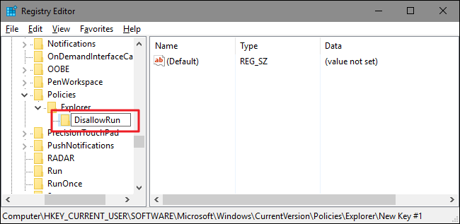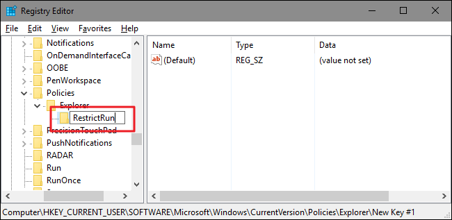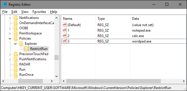 ‘Kayıt Defteri (Registry)’nde kullanıcıların sadece belli uygulamaları çalıştırabilmelerine izin verme, belli uygulamaları engelleme işlemi ile hemen hemen aynıdır. Yine, değişiklik yapmak istediğiniz kullanıcı hesabına giriş yapmanız gerekiyor. Giriş yaptıktan sonra ‘Kayıt Defteri Editörü (Registry Editor)’ çalıştırın ve aşağıdaki anahtara gidin.