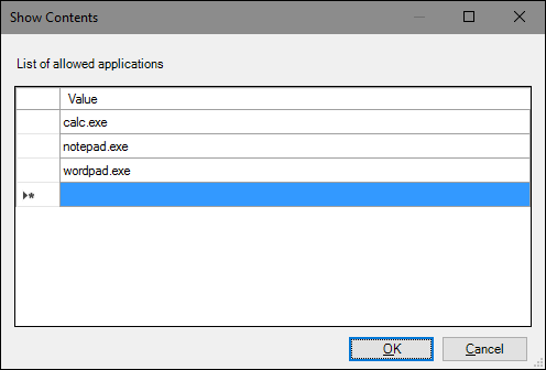 ‘İçerikleri Göster (Show Contents)’ penceresinde her bir satıra tıklayın ve kullanıcıların çalıştırmasına (açmasına) izin vermek istediğiniz uygulamaların çalıştırılabilir dosya isimlerini yazın (veya bir önceki adımda ‘Belli Windows uygulamalarını çalıştırma (Don’t run specified Windows applications)’ seçeneğini seçtiyseniz, kullanıcının çalıştırmasını (açmasını) istemediğiniz uygulamaların çalıştırılabilir dosya isimlerini yazın). Listeyi tamamladığınızda ‘Tamam (OK)’ butonuna tıklayın.
