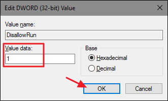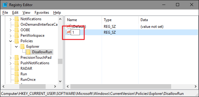 ‘DisallowRun’ değerine çift tıklayıp, bu değere ait özellikler penceresini açın. ‘Değer verisi (Value data:)’ kutucuğundaki 0 değerini silip 1 yaptıktan sonra ‘Tamam (OK)’ butonuna tıklayın.