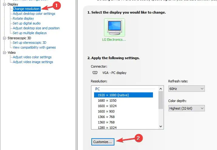 3. Sağ kısımda biraz ilerleyin ve Çözünürlüğü seç altında Özelleştir düğmesini tıklatın.