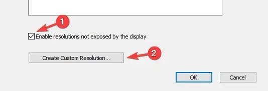 1. Görünen yeni pencerede, ekranda görünmeyen çözünürlükleri etkinleştir seçeneğini işaretleyin ve ardından Özel Çözünürlük Oluştur’u tıklayın.