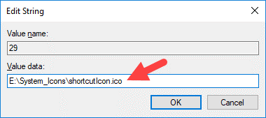 - “29” tuşuna çift tıklayın, Değer Verileri alanına simge konumunu girin ve değişiklikleri kaydetmek için “Tamam” düğmesine tıklayın. Yeni kısayol simgemi E sürücüsünde sakladığım için, Değer Verisi alanına “E: System_Icons kısayolIcon.ico” yazdım.