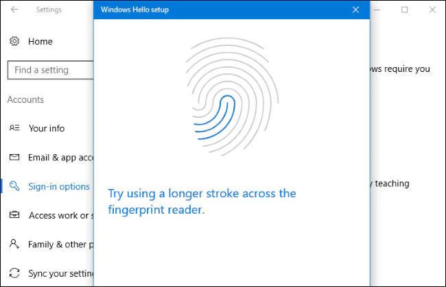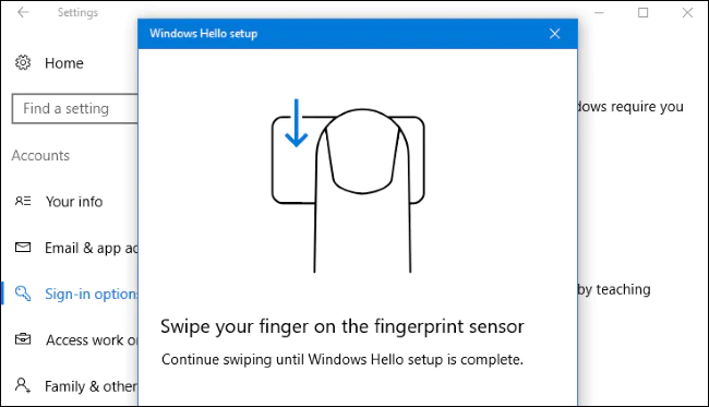 Windows sizi, parmak izi ayarı veya yüz tanıma ayarları için yönlendirecek (örneğin, parmak izi okuyucusunun, parmak izinizi tam olarak tarayıp tanıyabilmesini için, parmağınızı kaydırmanızı isteyecek).