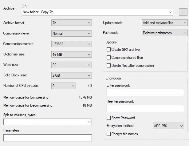 Yani, arşiv formatı, sıkıştırma seviyesi, sıkıştırma yöntemi ve diğerleriyle birlikte şifreleme yöntemi.