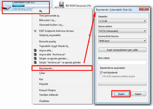 İlk adım olarak boş bir USB flash belleği bilgisayarımıza takıp biçimlendirelim.