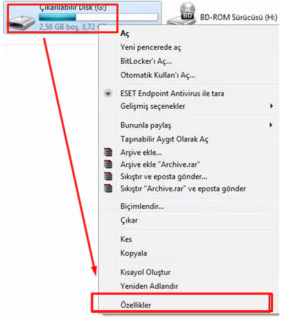 • Biçimlendirme işleminin ardından USB flash bellek simgesinin üzerine sağ tıklayıp, açılan menü listesin ‘Özellikler’ seçeneğine tıklayalım.