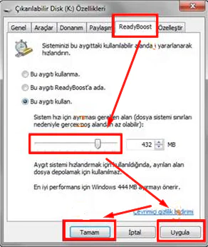 • Açılan penceresinde ‘Ready Boost’ sekmesine tıkıyoruz.