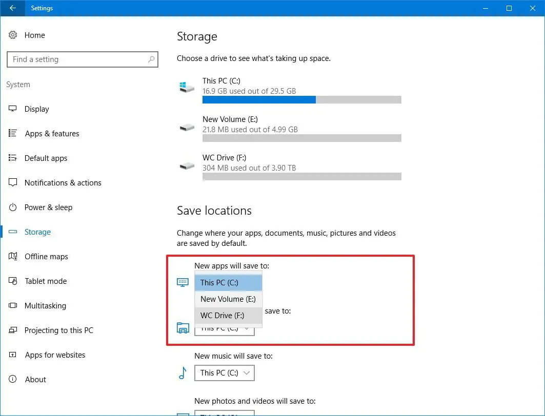 - ‘Kaydetme konumları (Save locations)’ başlığı altında, ‘Yeni uygulamalar şuraya kaydedilsin (New apps will save to)’ kısmında, uygulamaların kaydedileceği yeni konumu seçin.