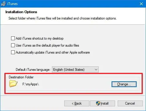 Örneğin, Apple’ın iTunes uygulamasını Windows 10’da yükleme işleminde kurulumu işlemini başlattıktan sonra, yükleme seçenekleri ekranında uygulamanın yükleneceği ayrı bir sürücü seçebilmek için ‘Değiştir… (Change…)’ butonu ile birlikte ‘Hedef Klasör (Destination Folder)’ seçeneği vardır.